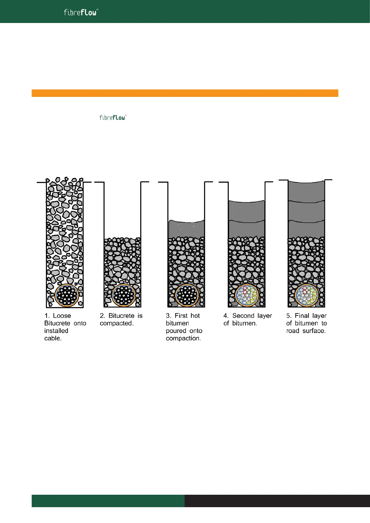 1. Once the protected microduct (Direct Buried) has been placed, the slot can be loosely fi lled with cold ‘Bitucrete’ (bitumen coated fi ne