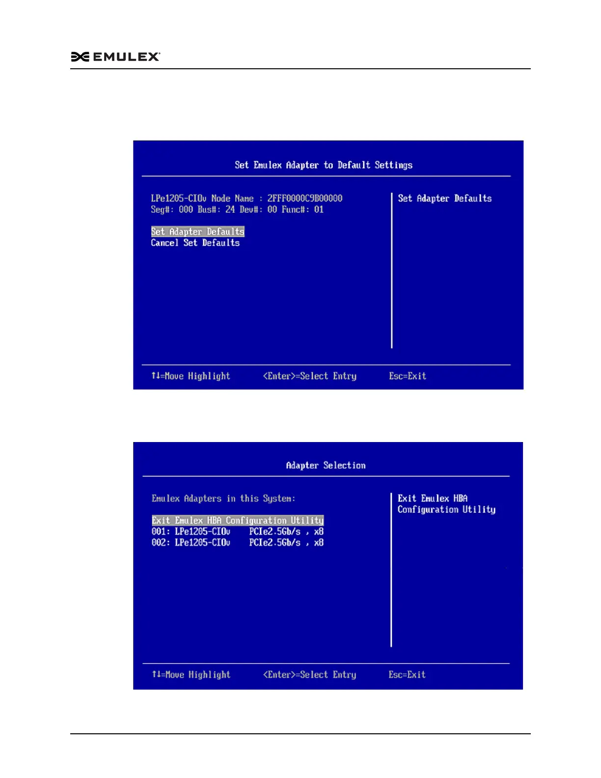 2. From the Main menu, select Set Emulex Adapters to Default Settings and press