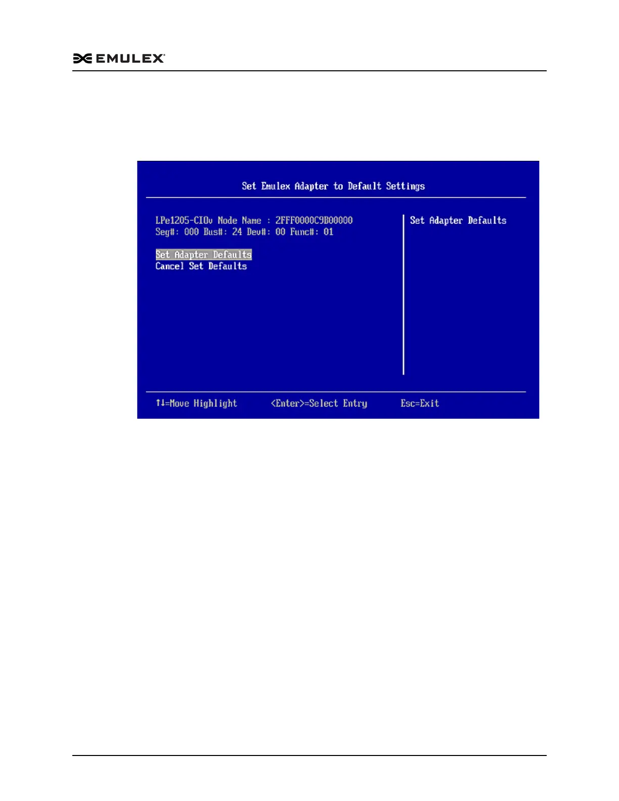 5. Select Set Emulex Adapter to Default Settings and press <Enter>. The Adapter
