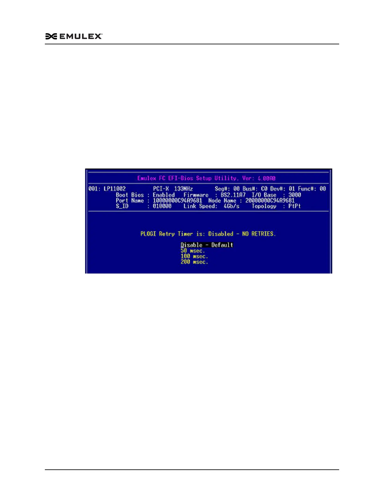 Figure 6-12 PLOGI Retry Timer Setup Screen