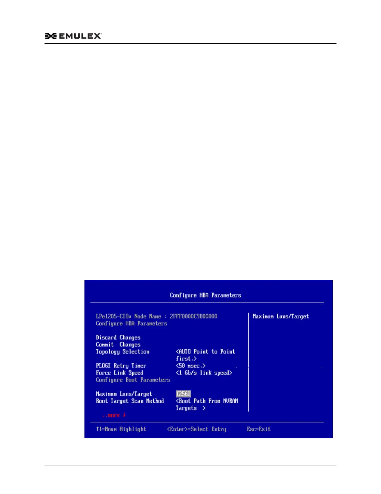 2. From the Configure Boot Parameters menu, navigate to Maximum LUNs/Target