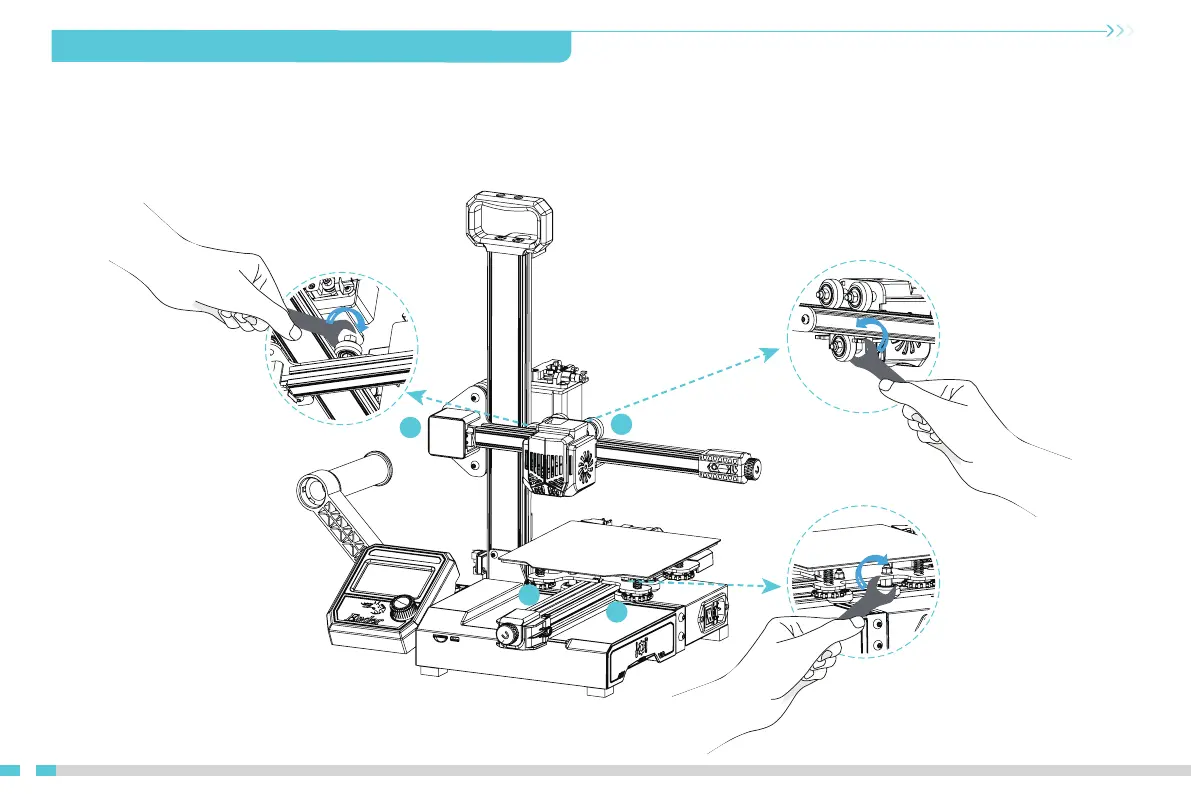 X/Y/Z axis V-wheel adjustment: After the machine is assembled gently dial the wheel to check whether it is idling or stuck. If this phenom-