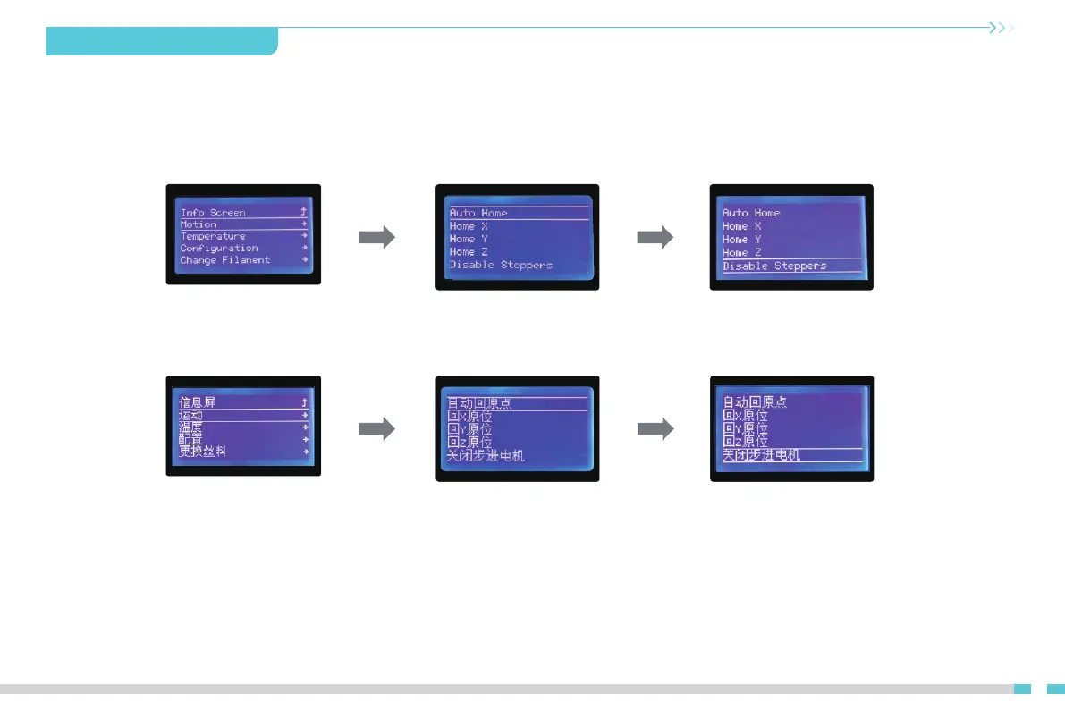 Motion →Auto Home→ Disable Steppers (Release the motor). | 运动→自动回到原点→ 关闭步进电机(释放电机)