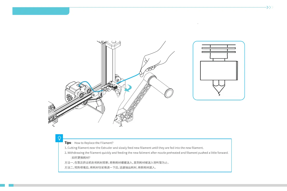 当温度达到目标温度时,用手捏住挤出夹,将耗材插入挤出机小孔直至喷嘴位置,看到喷嘴处有耗材流出即表示耗材已经装载完成。