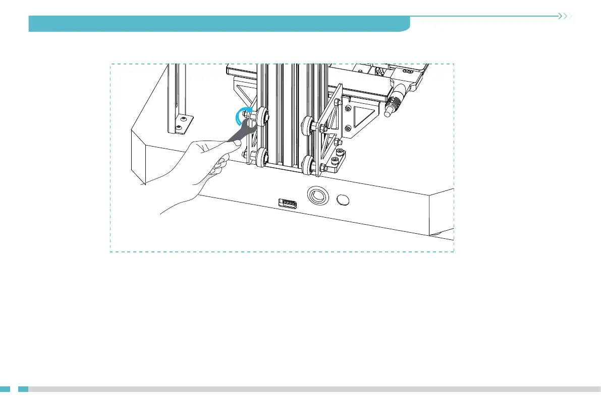用手轻拨V轮,检查其是否有空转,如有此现象请使用开口扳手按图示方向调节偏心隔离柱,使V轮无空转。