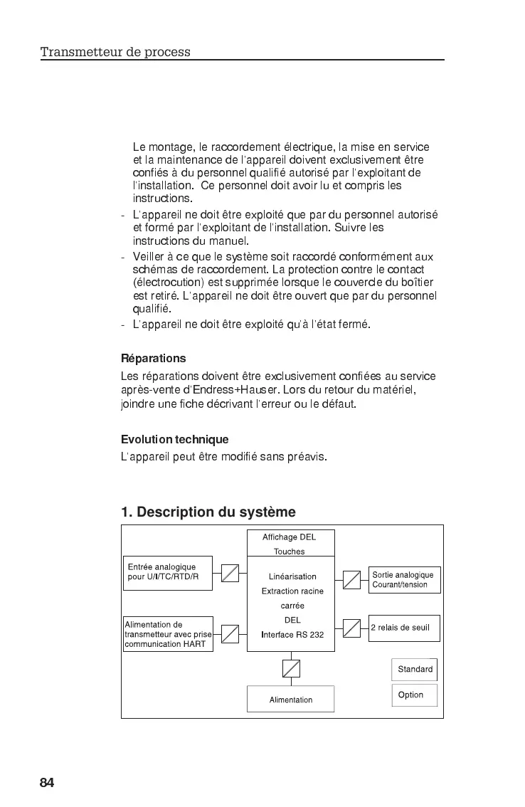 Endress+Hauser RMA 421 - Personnel de Montage, de Mise en Service et Dexploitation; Description du Système