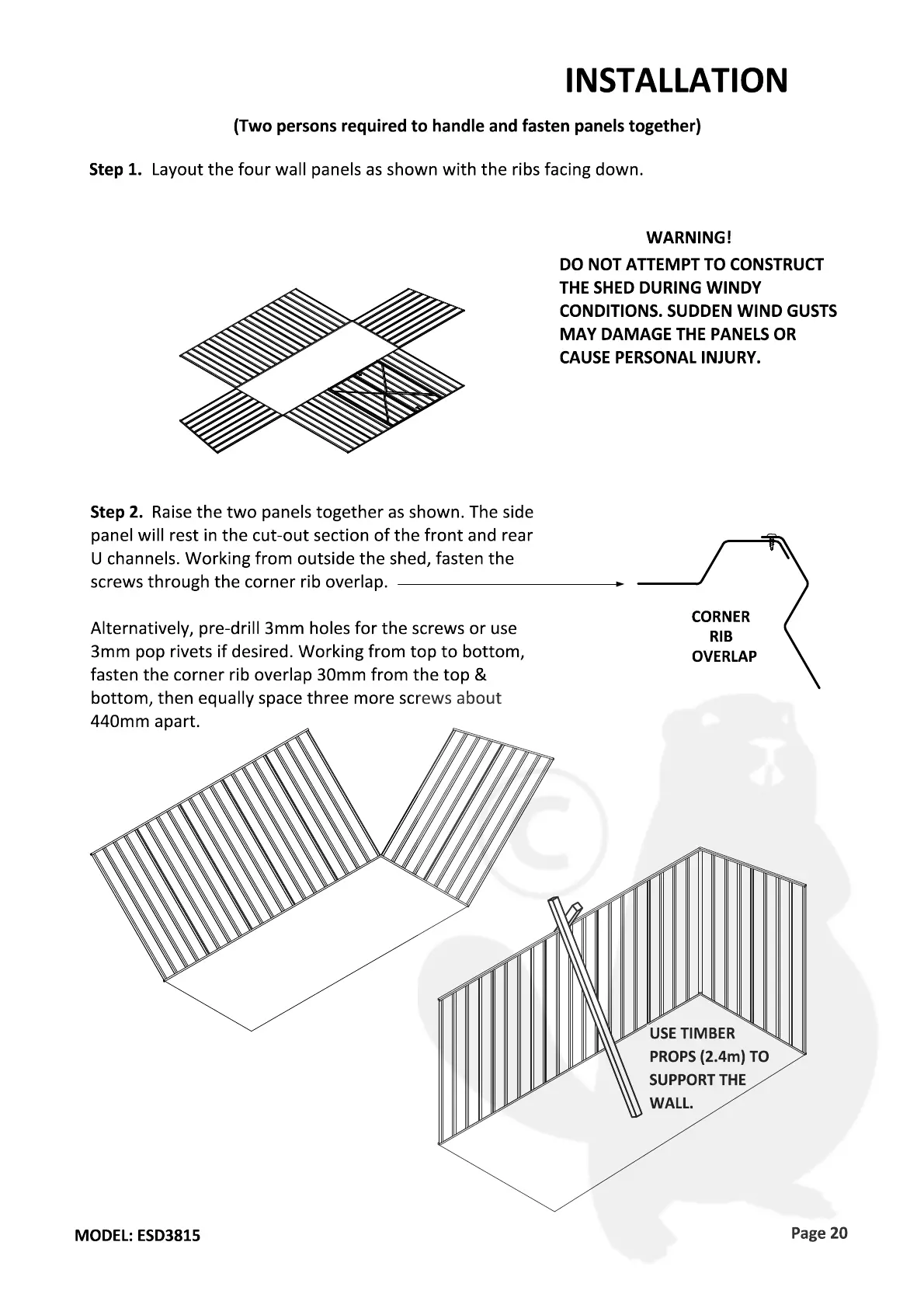 EnduraShed ESD3815 - Installation; Wall Panel Layout and Raising; Corner Rib Fastening