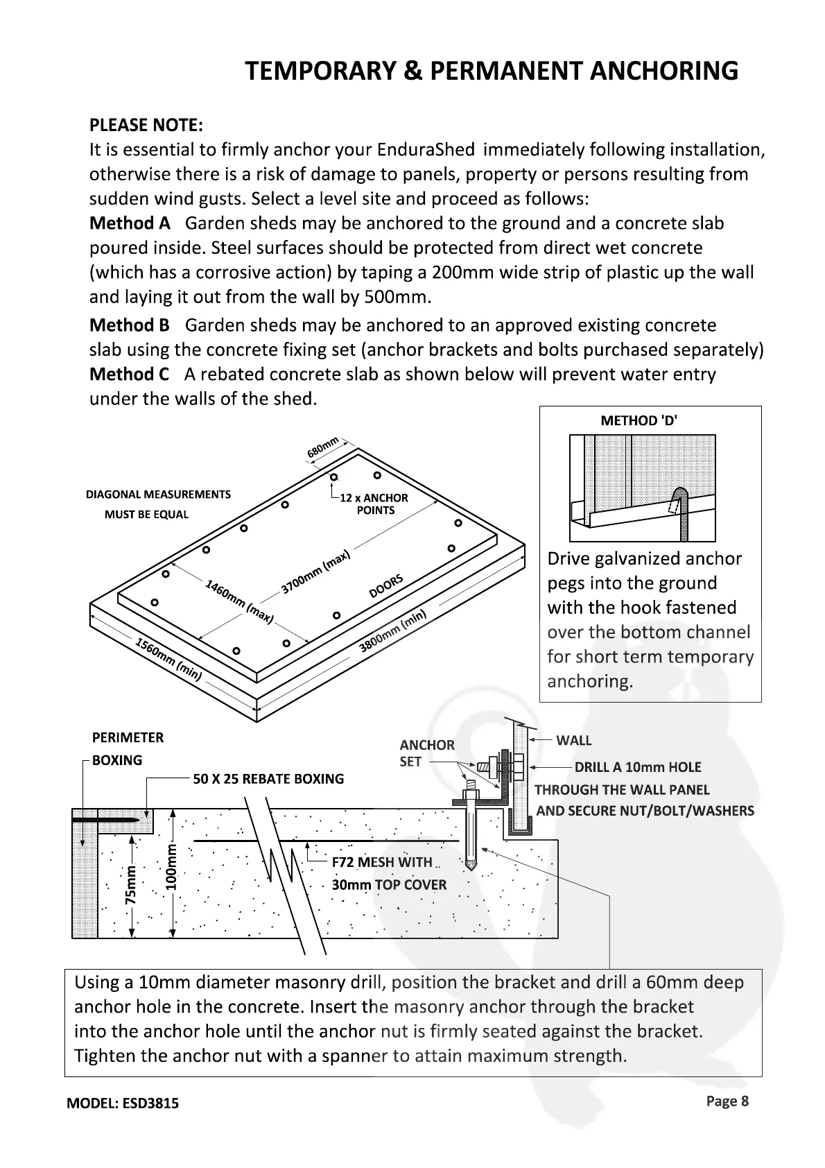 EnduraShed ESD3815 - Temporary & Permanent Anchoring; Anchoring Methods; Concrete Anchoring Procedure