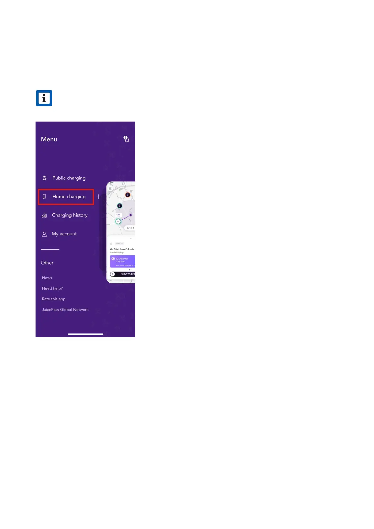 1. On the top left corner of the home screen, select 3 horizontal lines > Home Charging.