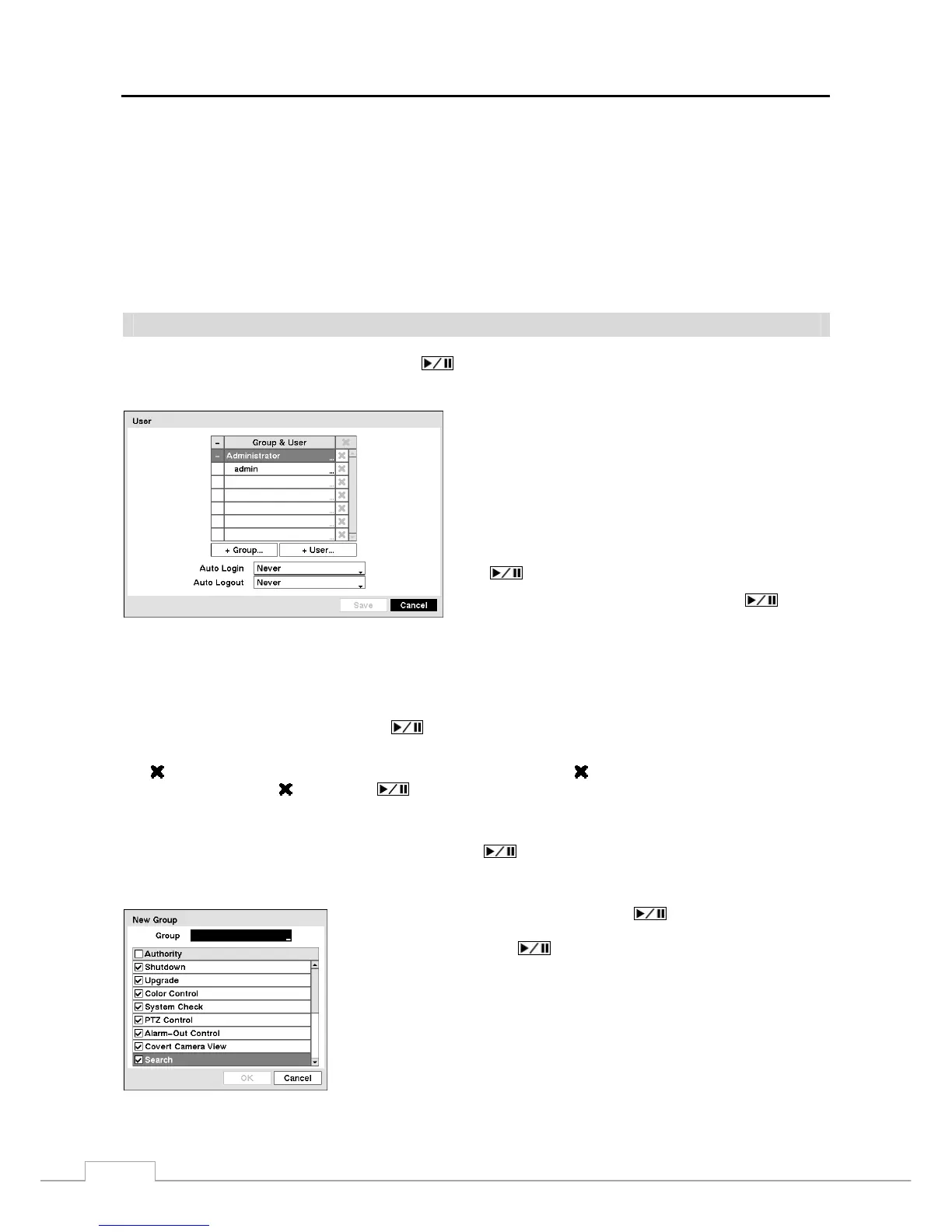 and users. You can add and delete groups and users. When adding a group, you can assign authority levels to the group.