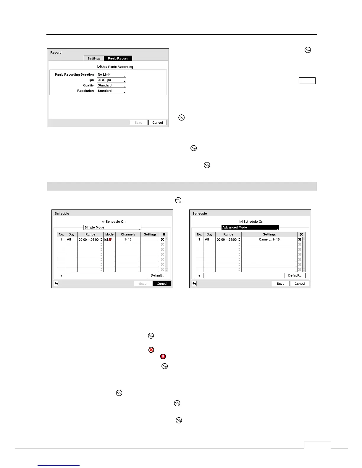records video based on the schedule established in the Schedule screen. When turning Schedule recording Off, you