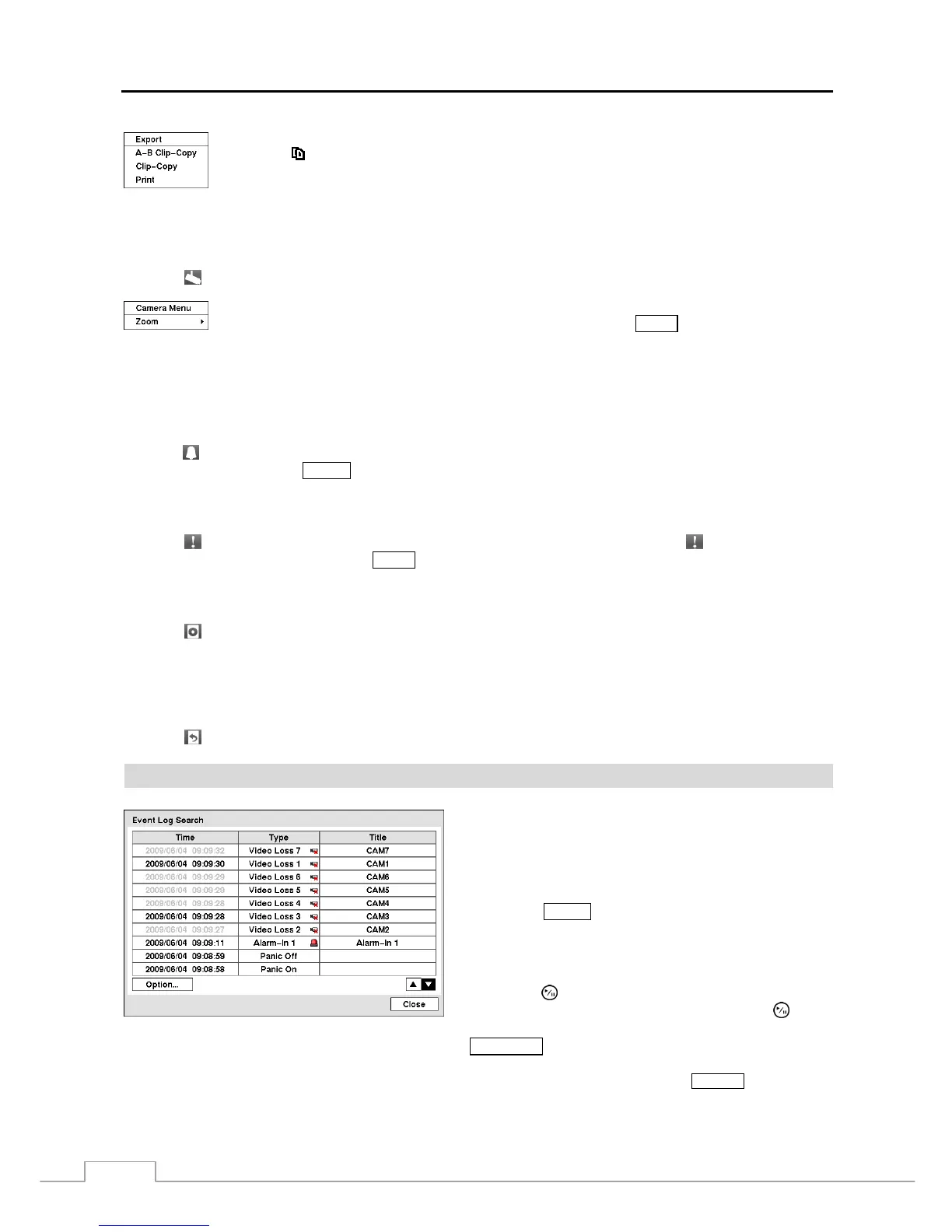 (Alarm Reset) in the Search menu resets the DVR’s outputs including the internal buzzer during an alarm.