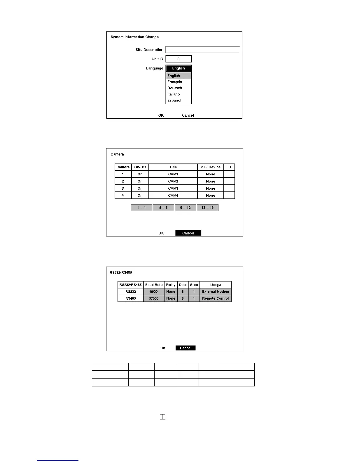D. Set „PTZ Device” and „ID” of the dome camera. Select RS232/RS485 after PTZ is installed, and then set-up as below table.