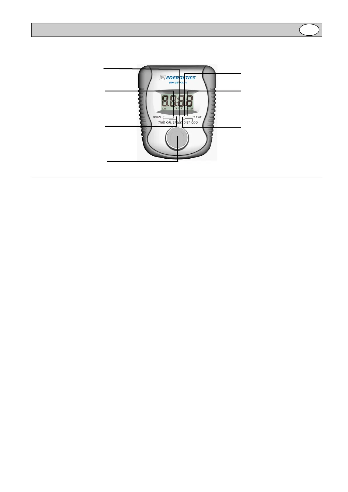 REŽIM 1. Toto tlačítko použijte pro přepínání hodnot na displeji (Čas - Kalorie - Počítadlo kilometrů -