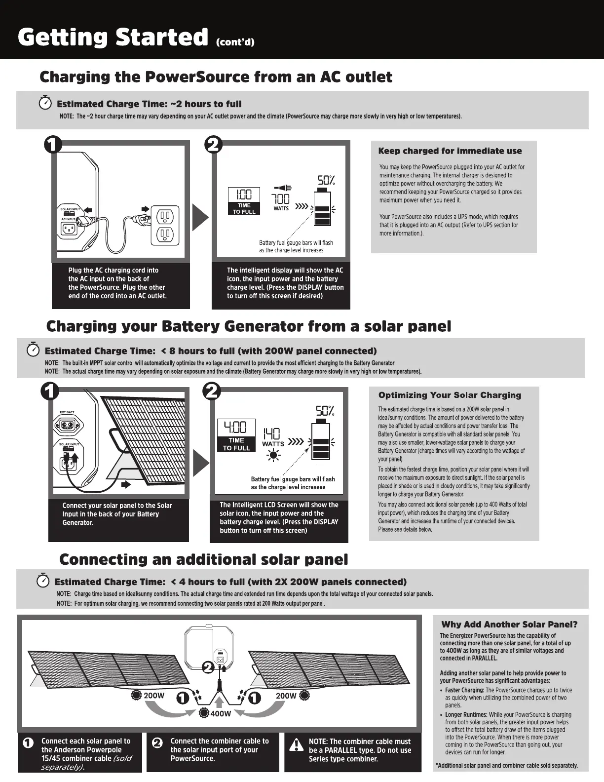 Energizer PowerSource Pro - Charging the PowerSource from an AC outlet; Charging your Battery Generator from a solar panel; Connecting an additional solar panel