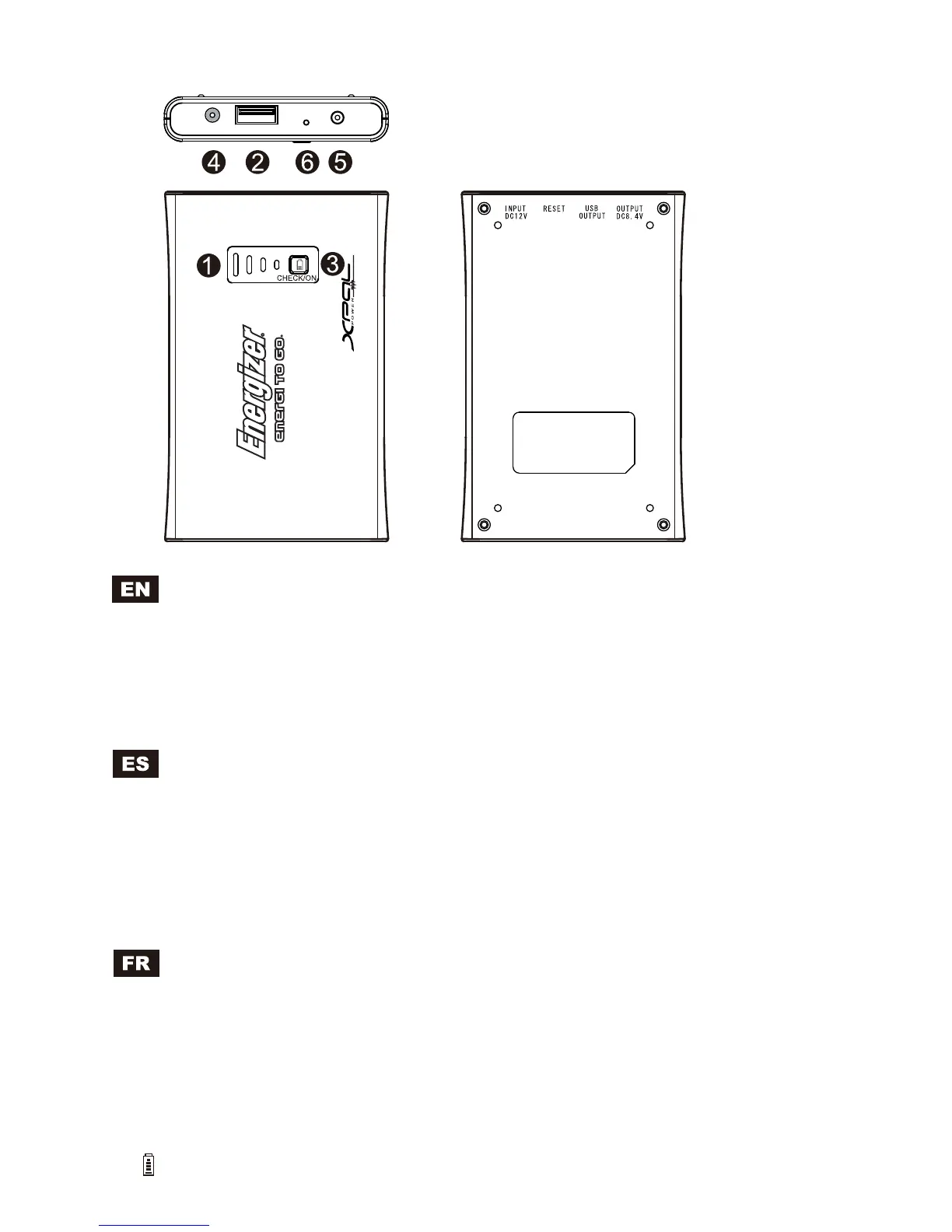 1. LED Indicador de la Vida de Bateria 2. Puerto de Salida USB 5V