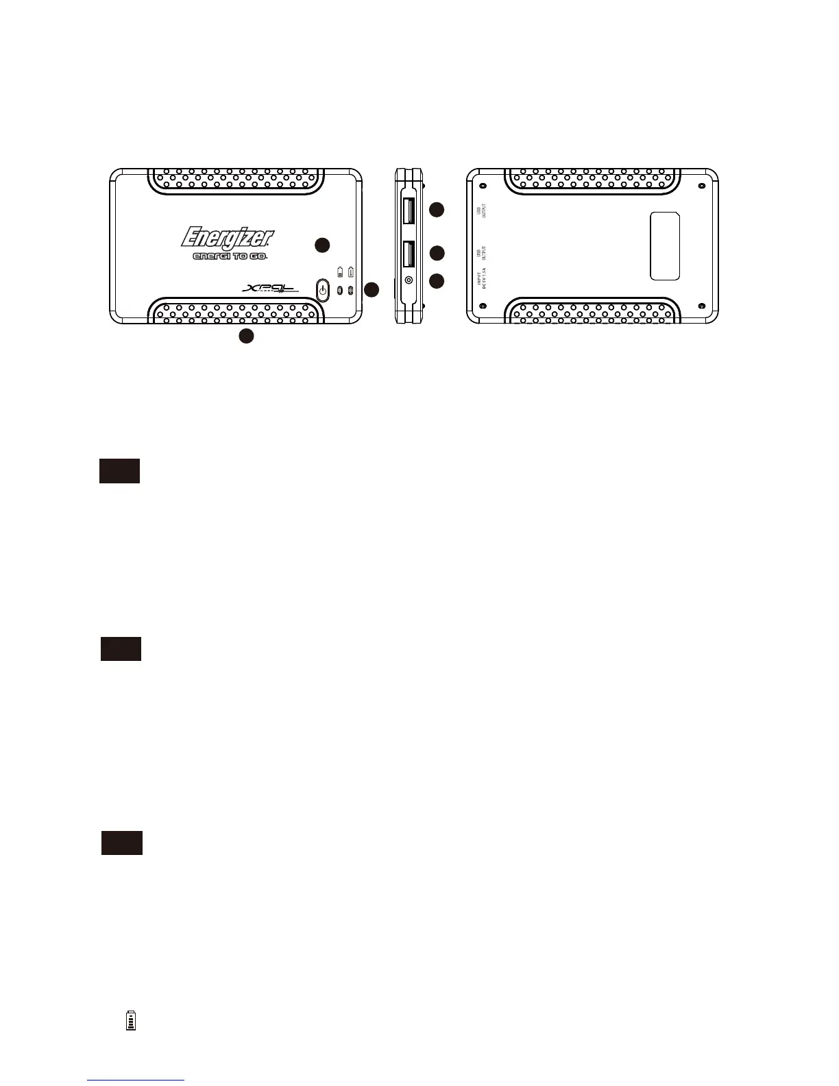1. LED Battery Life Indicator 2. 5V USB Output Port 3. LED Activation Button