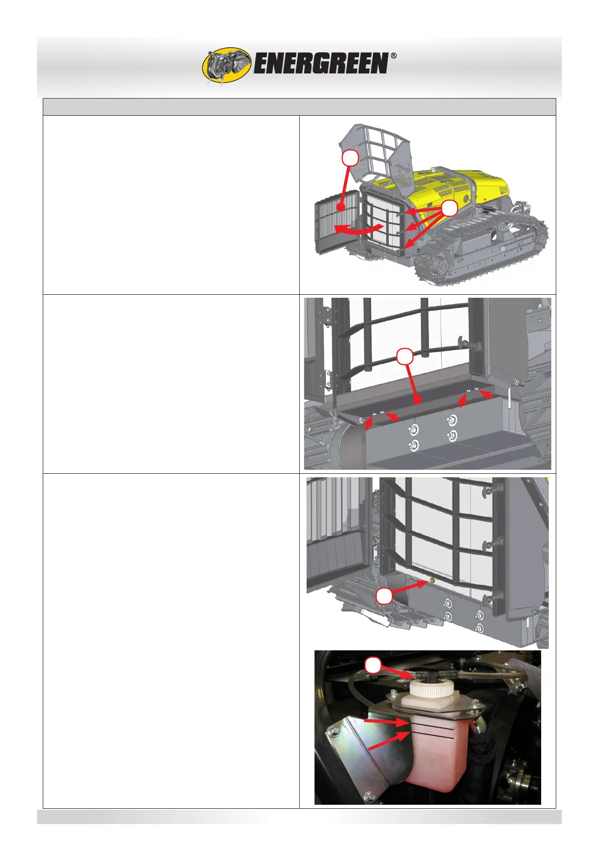 • Release the three tie rods (F) and open the radiator