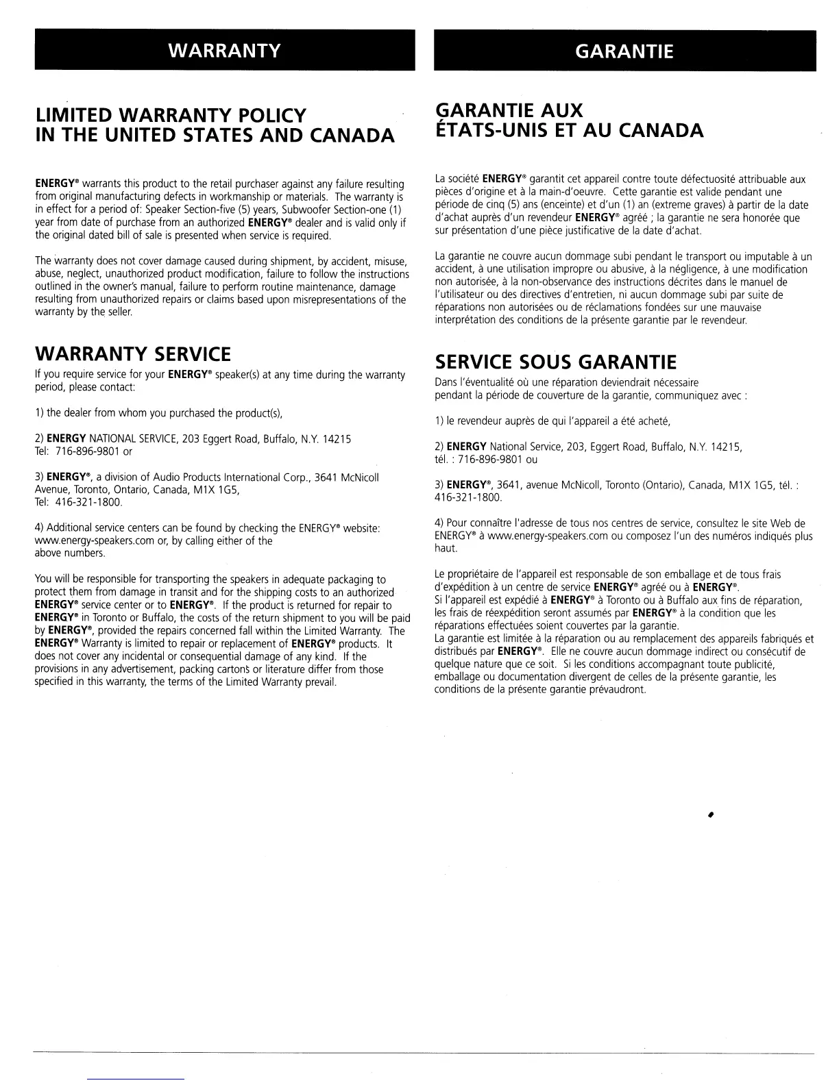 Energy S8.3 - Warranty Service