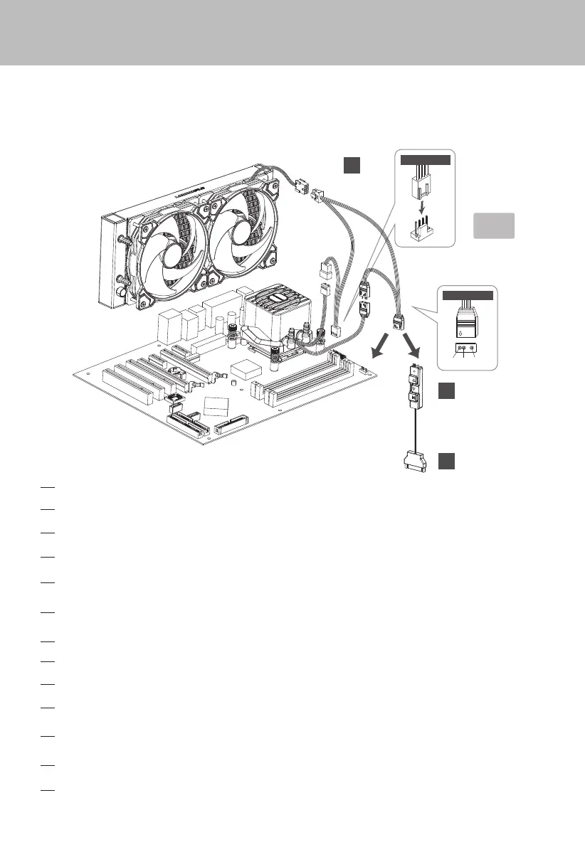 CPUFANまたはCPUOPTの4ピンヘッダとARGBヘッダに接続します。または、ARGBコントロールボックスを通じてファンとポンプ