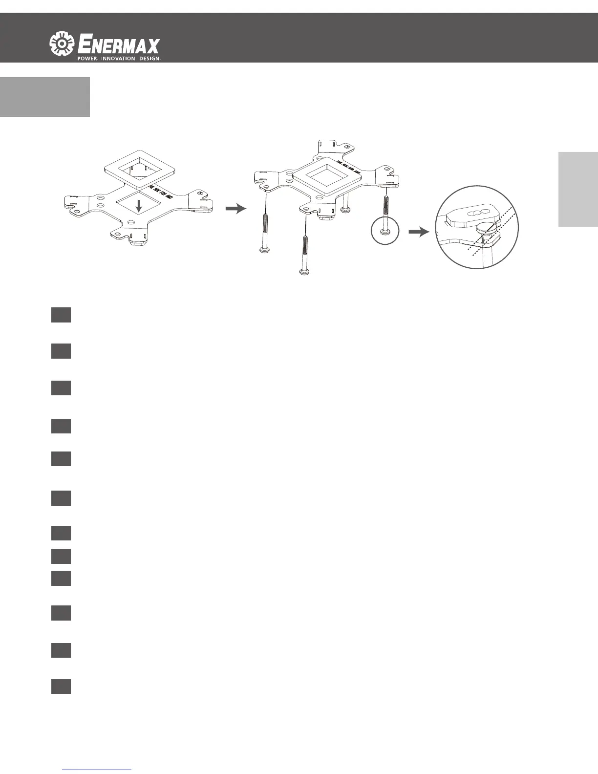 將方形墊片置於背板中央孔位,依系統CPU腳位將定位螺絲固定於背板相對應孔位。