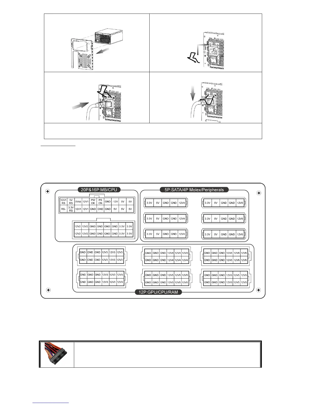 *您必須將 16 針與 20 針模組線材接頭連接到對應的電源供應器模組插座,以使 24 針主機板與 8 針 CPU 接