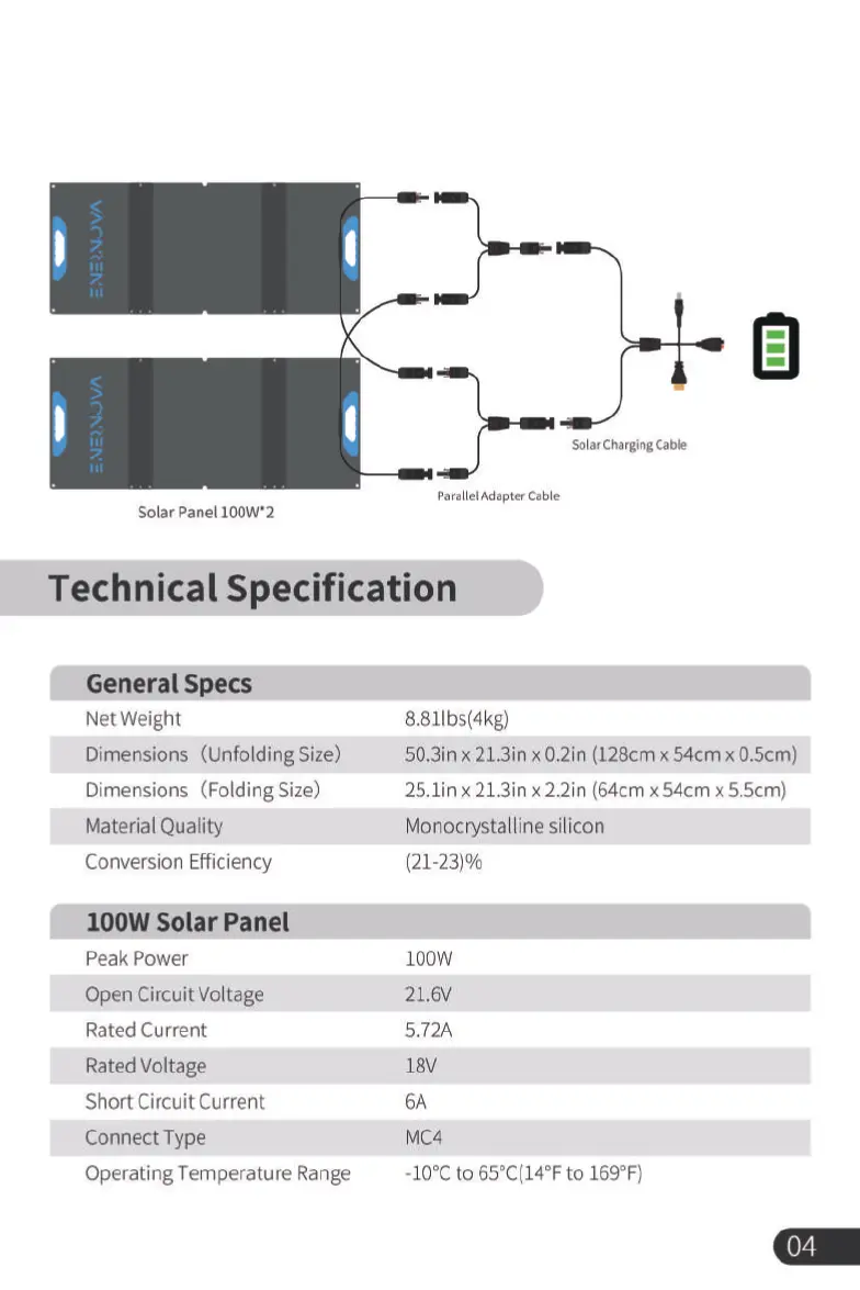 Enernova Solar Panel 100W - Technical Specifications; General Specifications; 100 W Solar Panel Details