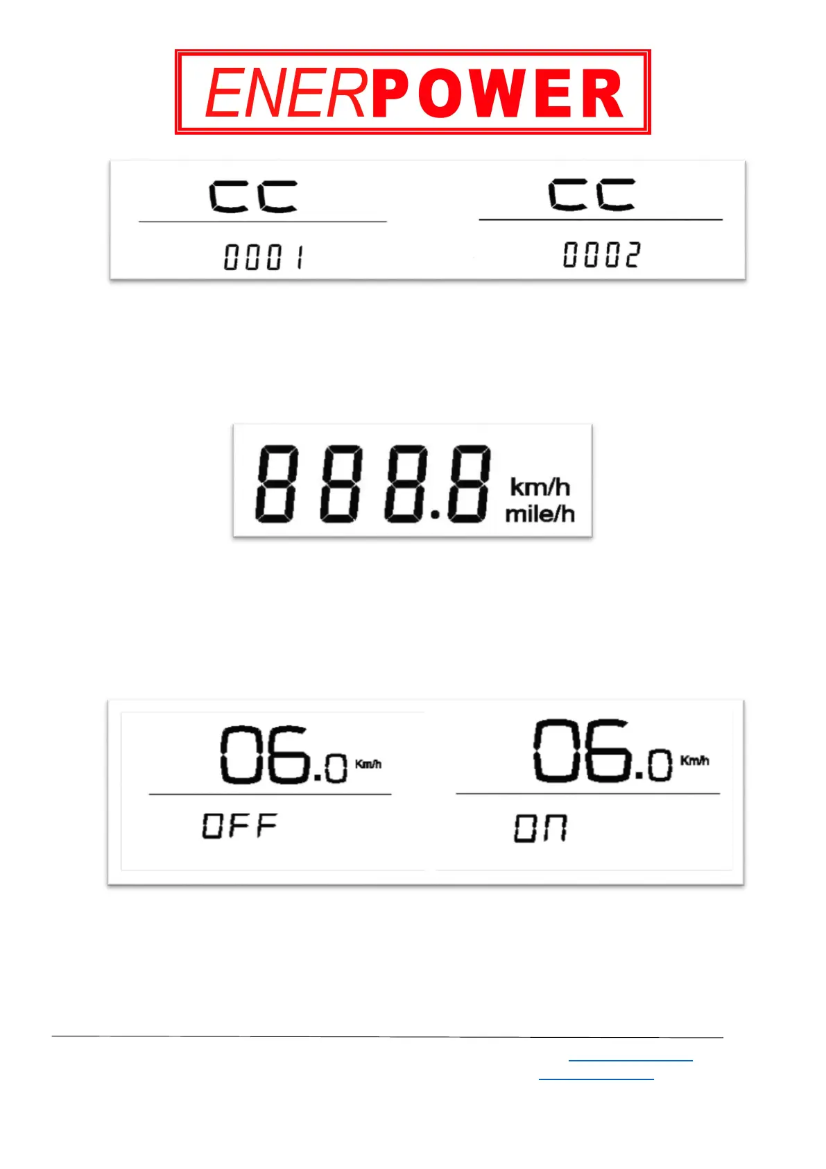ON/OFF. Default is OFF. Press and hold the – button for 3 seconds in neutral to enter the 6Km/h