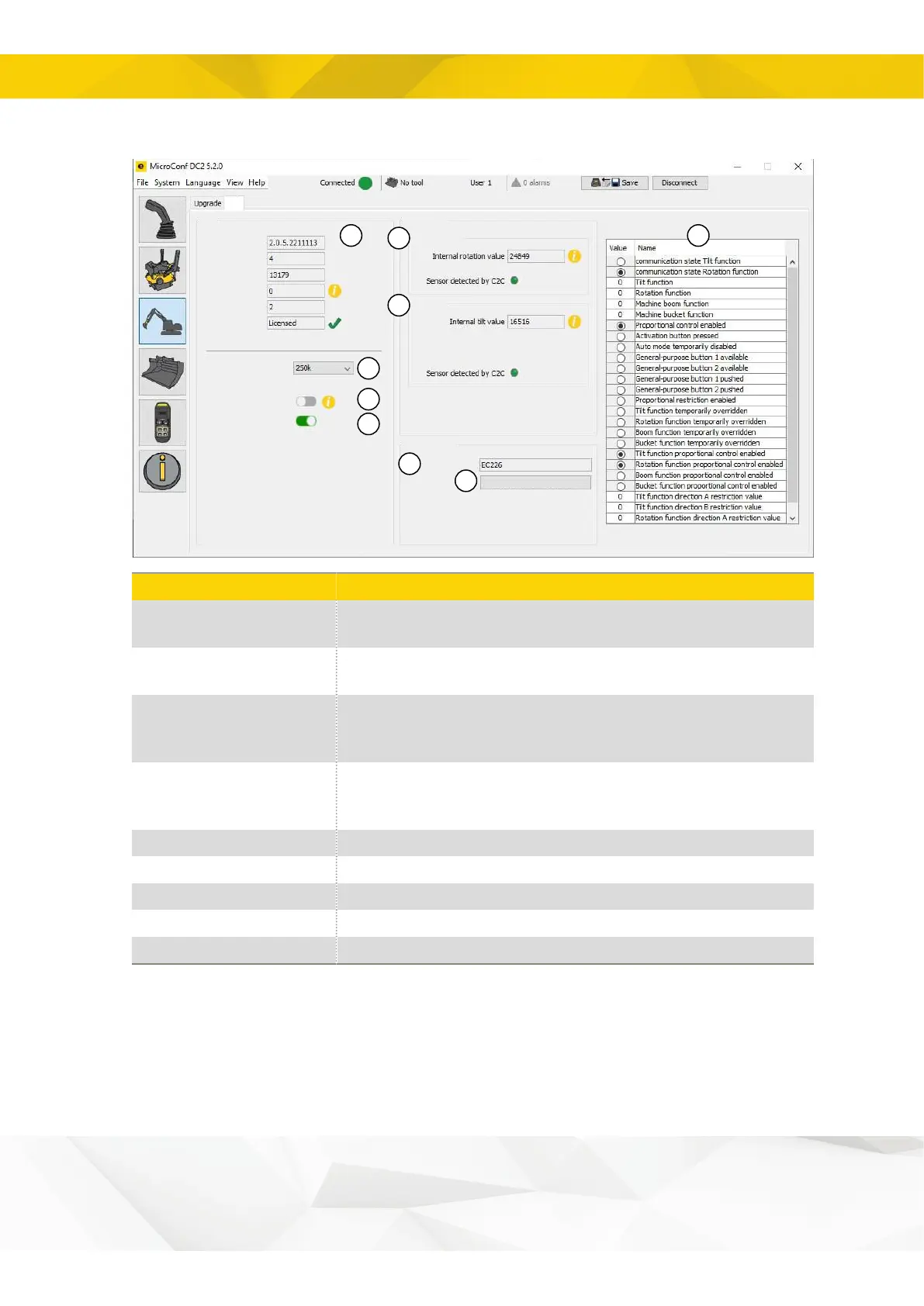 Rotation sensor information: rotation data, CAN status and C2C status.