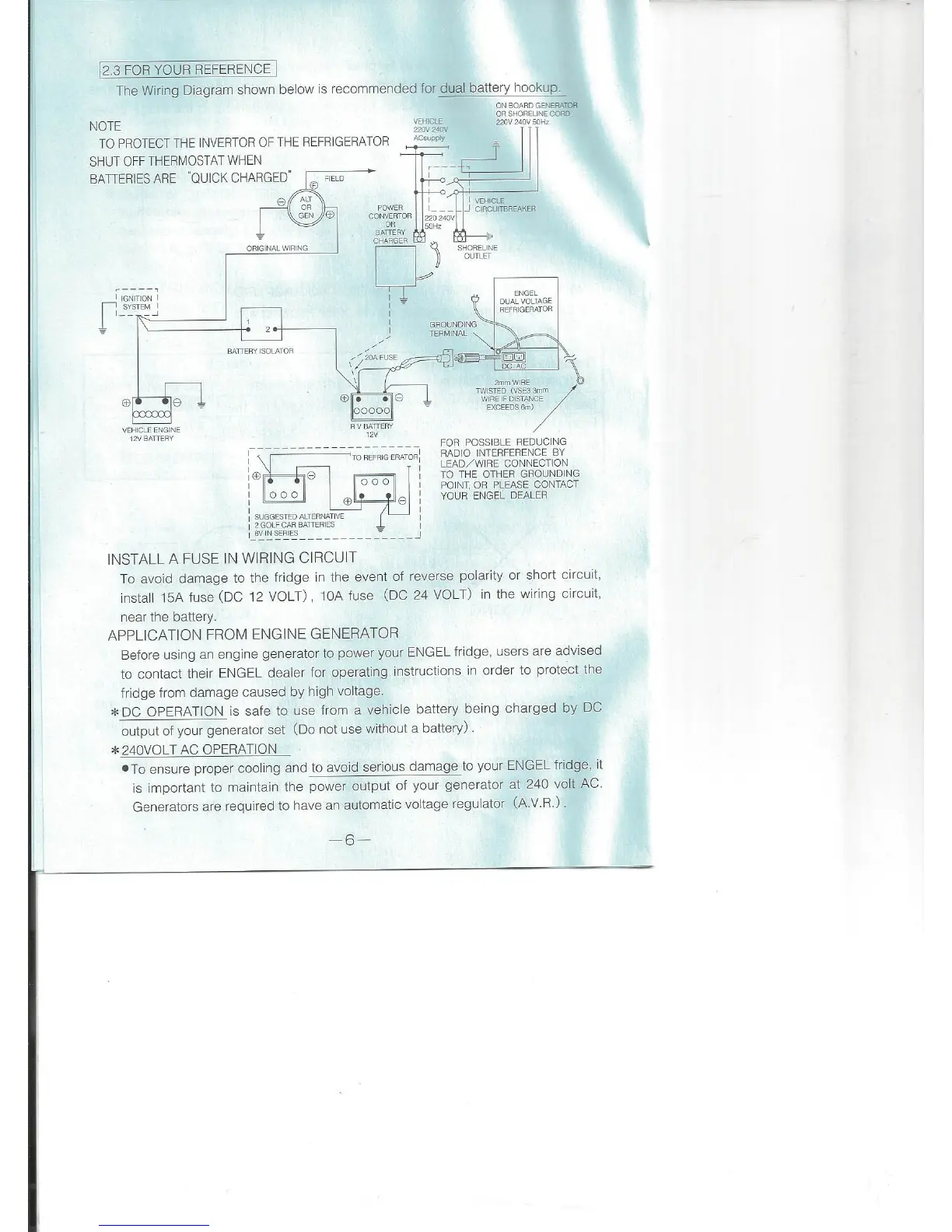 Engel MT60F-G4-S; MT80F-G4-S - Wiring Diagrams and Recommendations; Fuse Installation for Wiring Circuit; Engine Generator Operation Guidelines