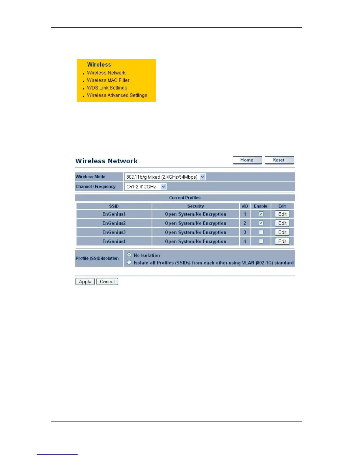 Channel: You may configure up to four different wireless profiles. Click on the Edit