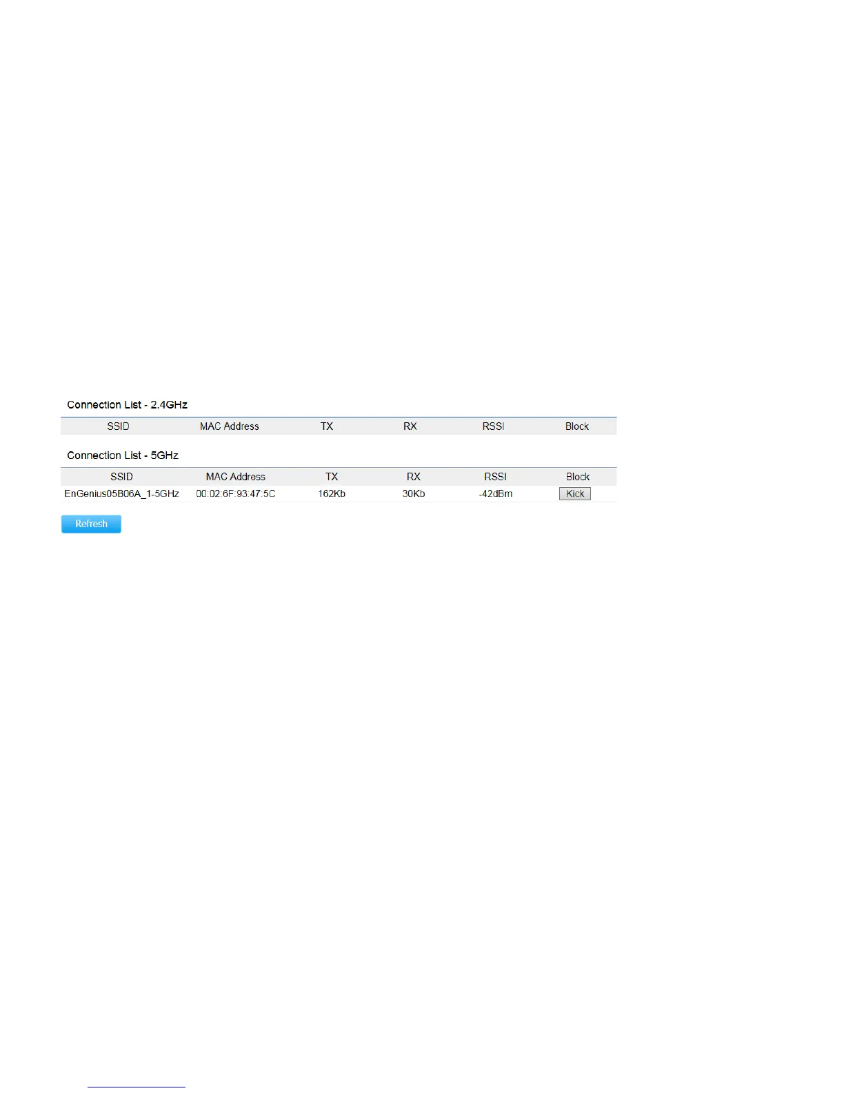 2.4GHz/5GHz, along with the MAC address, TX, RX and signal strength for each client. Clicking