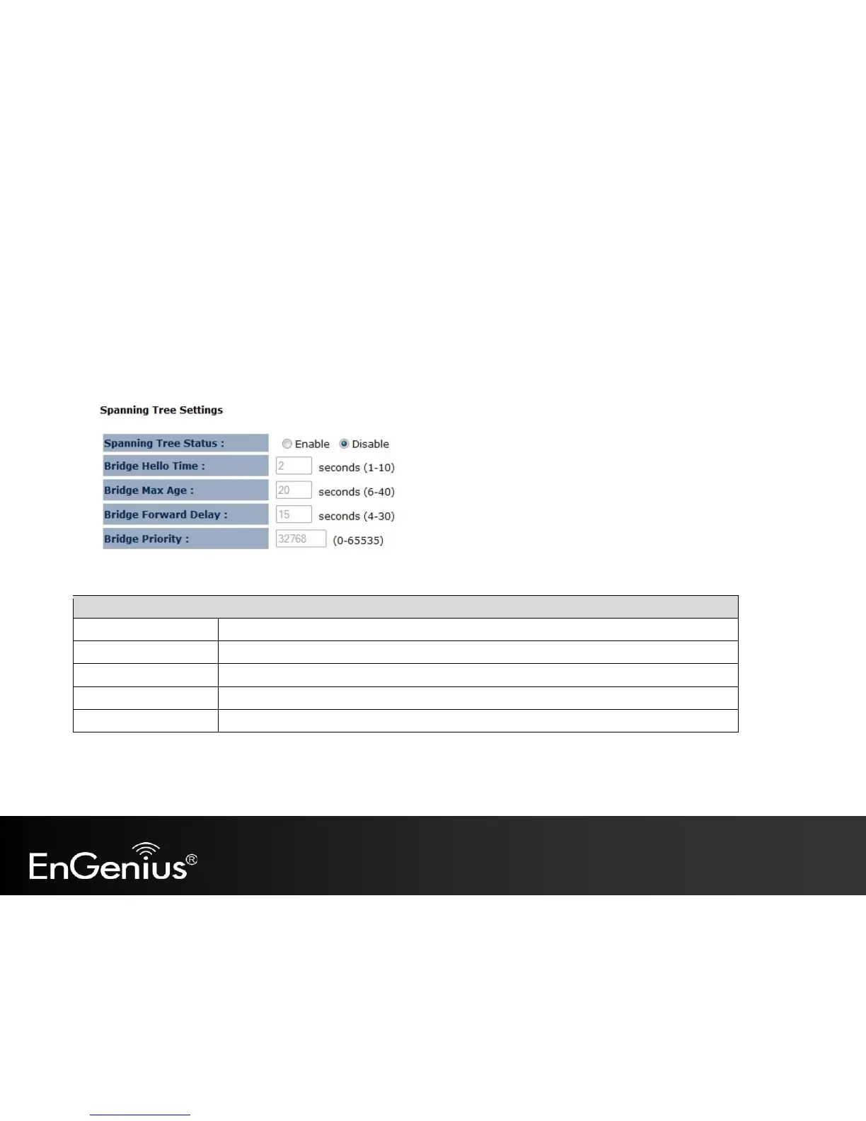 The Spanning Tree option of the Network menu allows you to set the EAP150 to use the Spanning Tree Protocol.