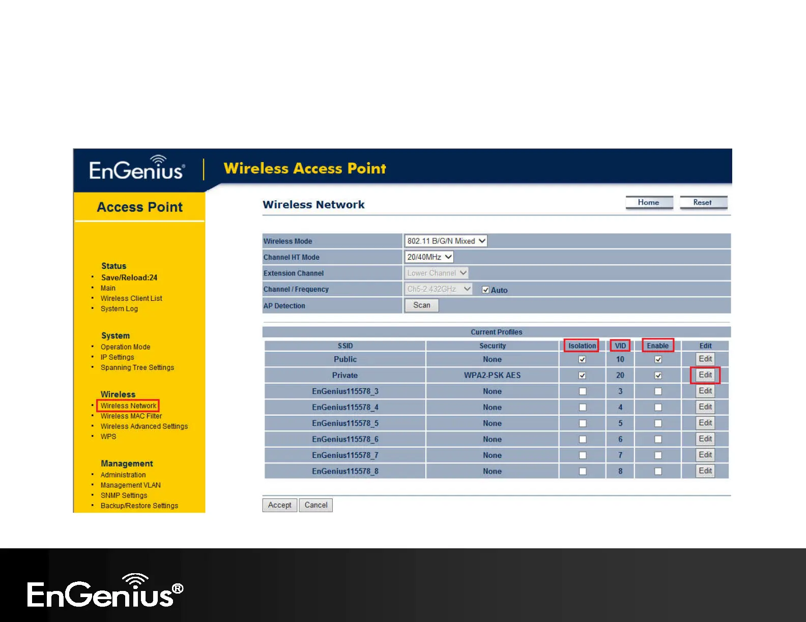 Step 2. Setup the wireless settings. Click Edit on the SSID you want to configure. Note The Isolation checkbox tells the