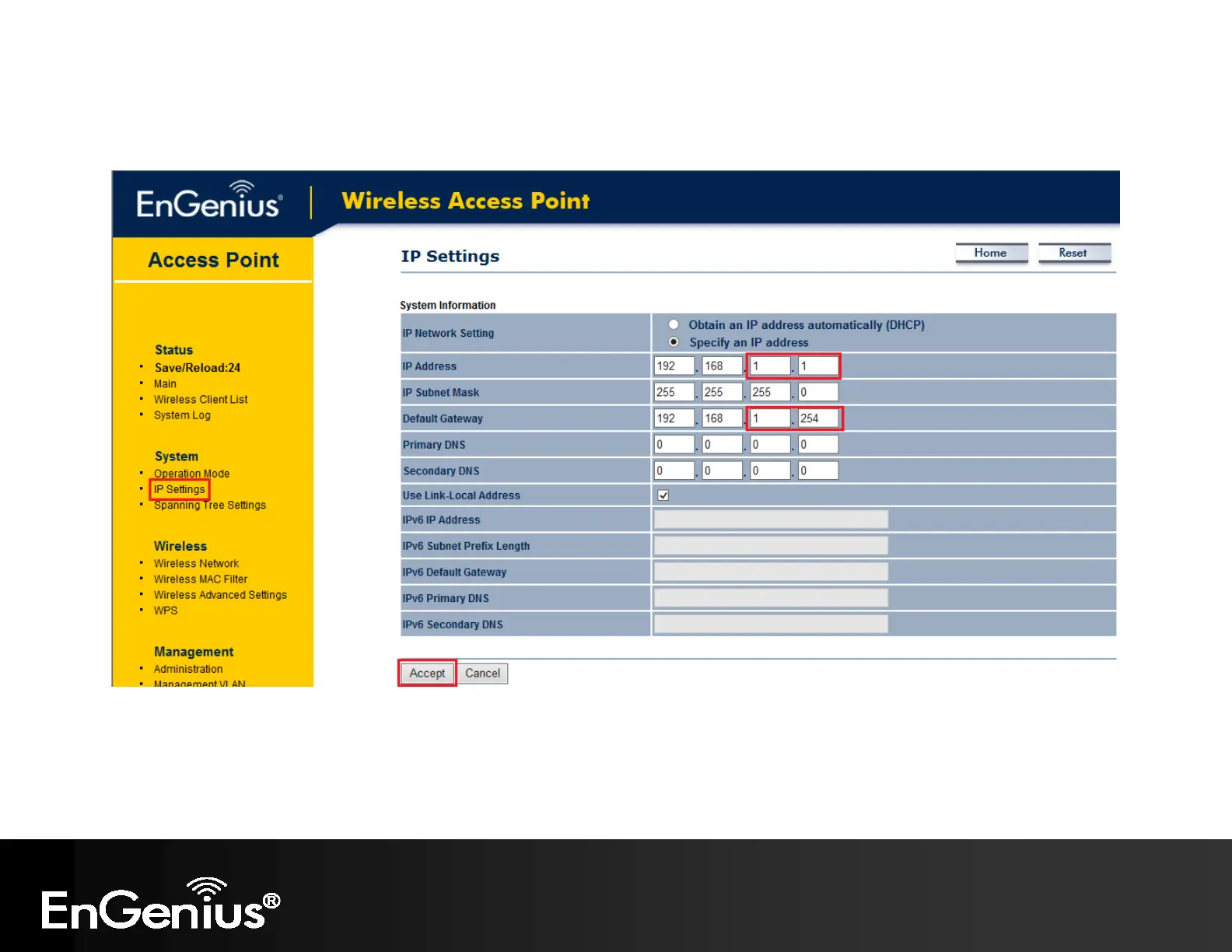 Step 5. Please set your unit to be in the subnet that you want to mange the device in, pointing to the proper default