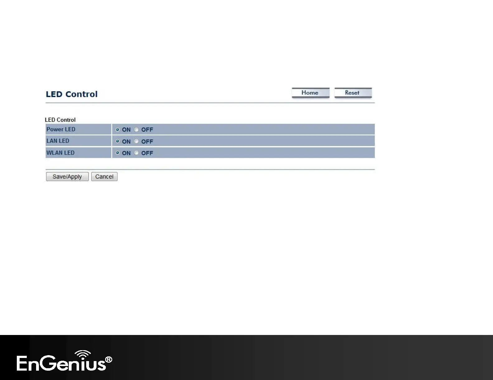 This page allows you to control LED on/off for Power, LAN interface and WLAN interface.