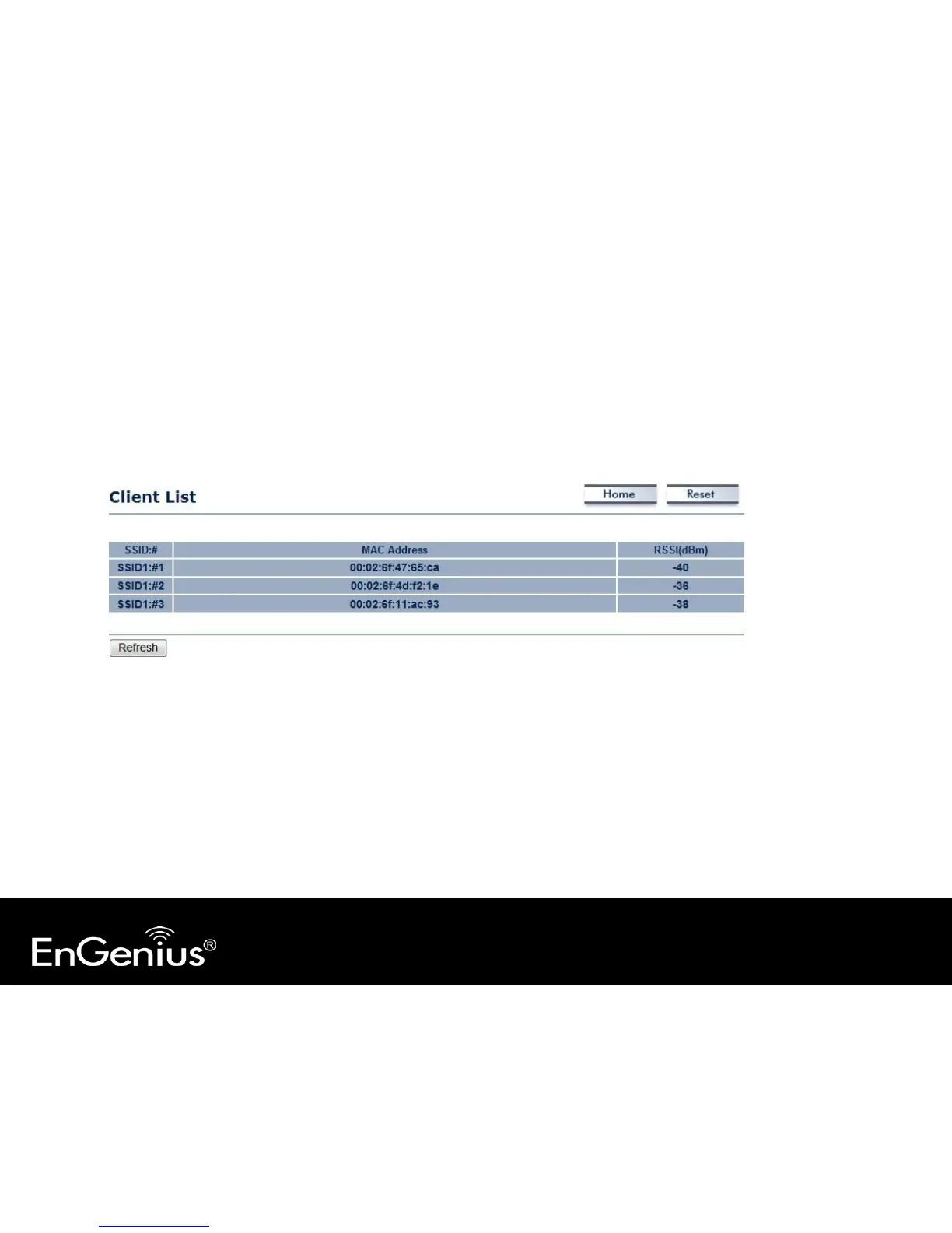 with the MAC addresses and signal strength for each client. Clicking the [Refresh] button updates (refreshes) the client