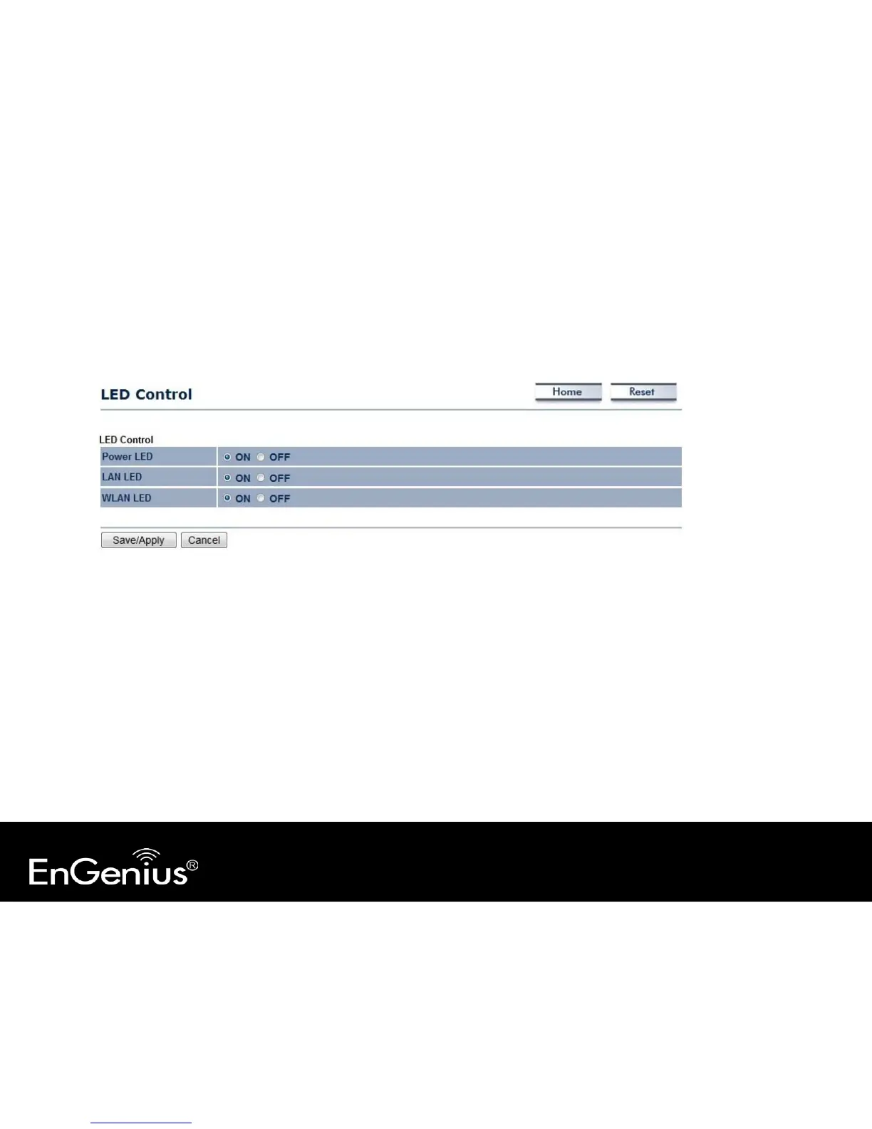 This page allows you to control LED on/off for Power, LAN interface and WLAN interface.