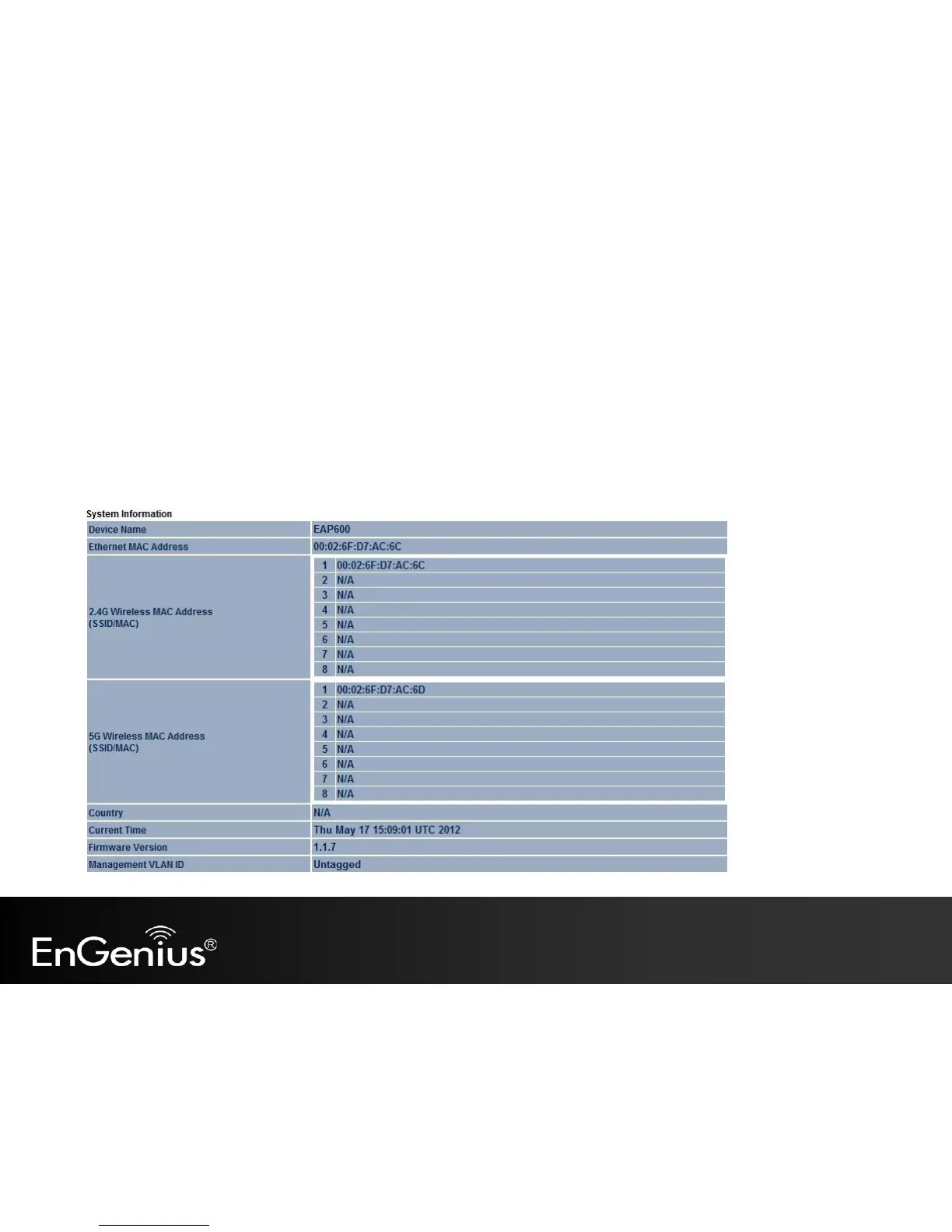 Clicking the Main link under the Status menu or clicking Home at the top-right of the EAP600 Page shows the status