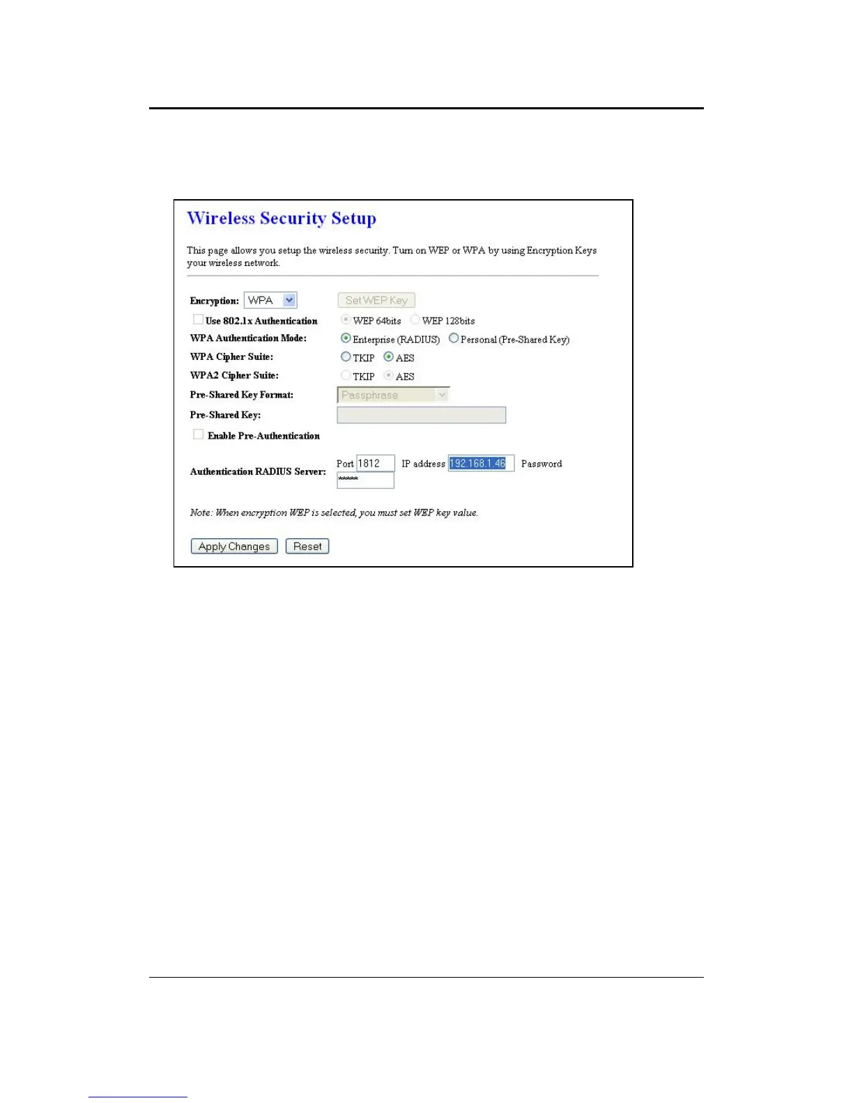WPA Authentication Mode: Select the Enterprise (RADIUS) radio button.