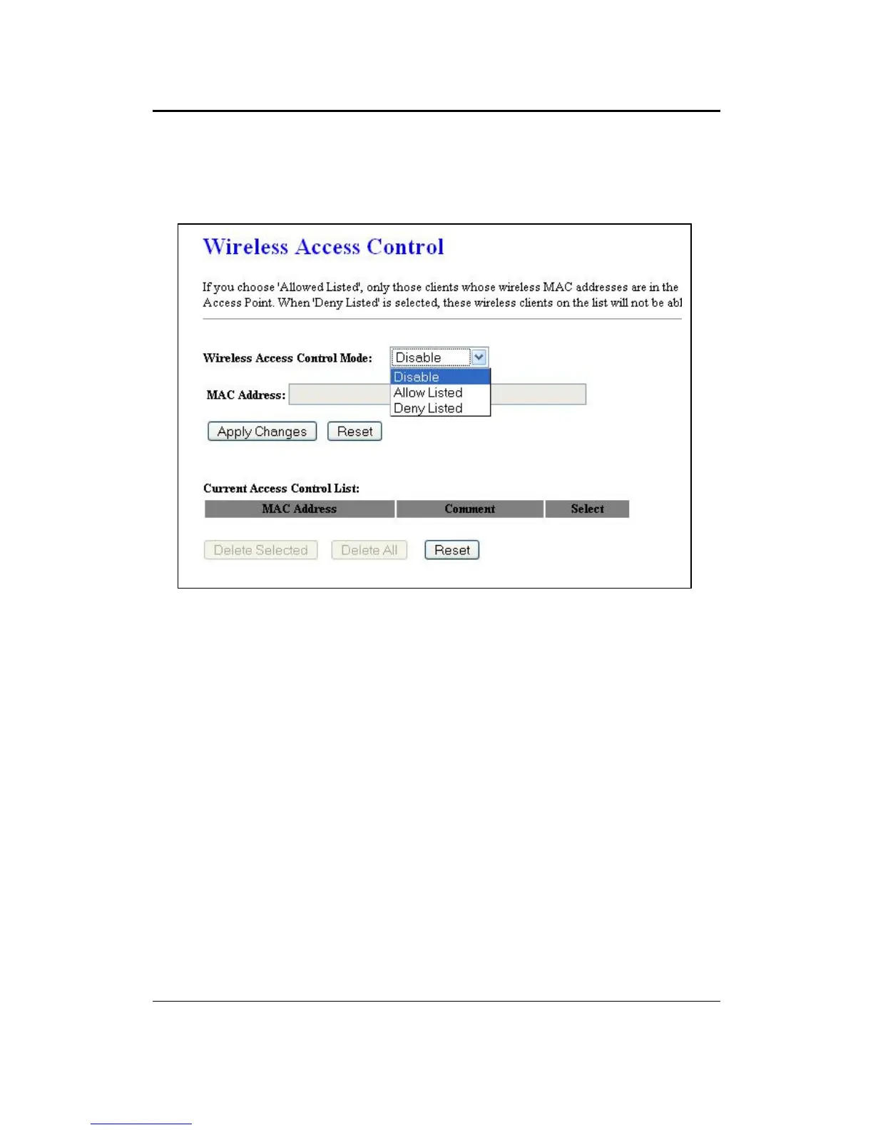 Wireless Access Control Mode: You may choose to Disable, Allow Listed, or