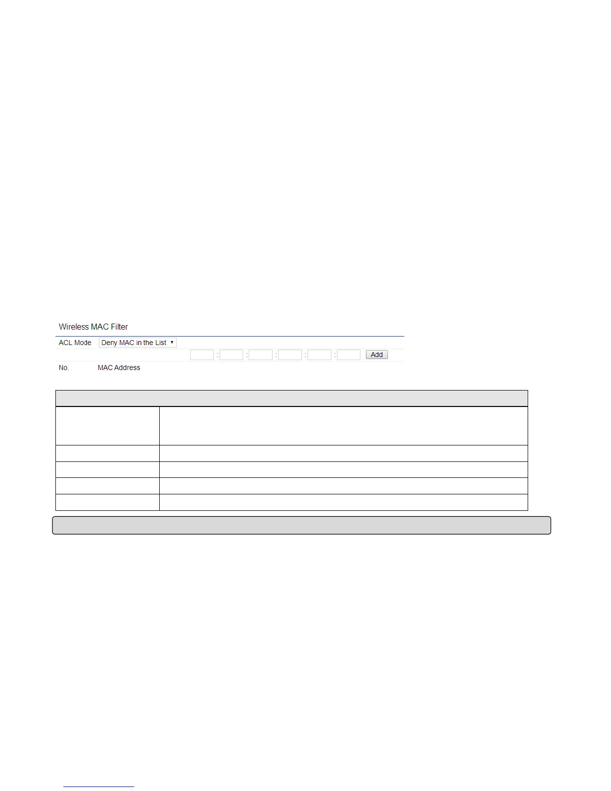 smartphones, etc.) according to their MAC addresses. You can manually add a MAC address to restrict the permission to