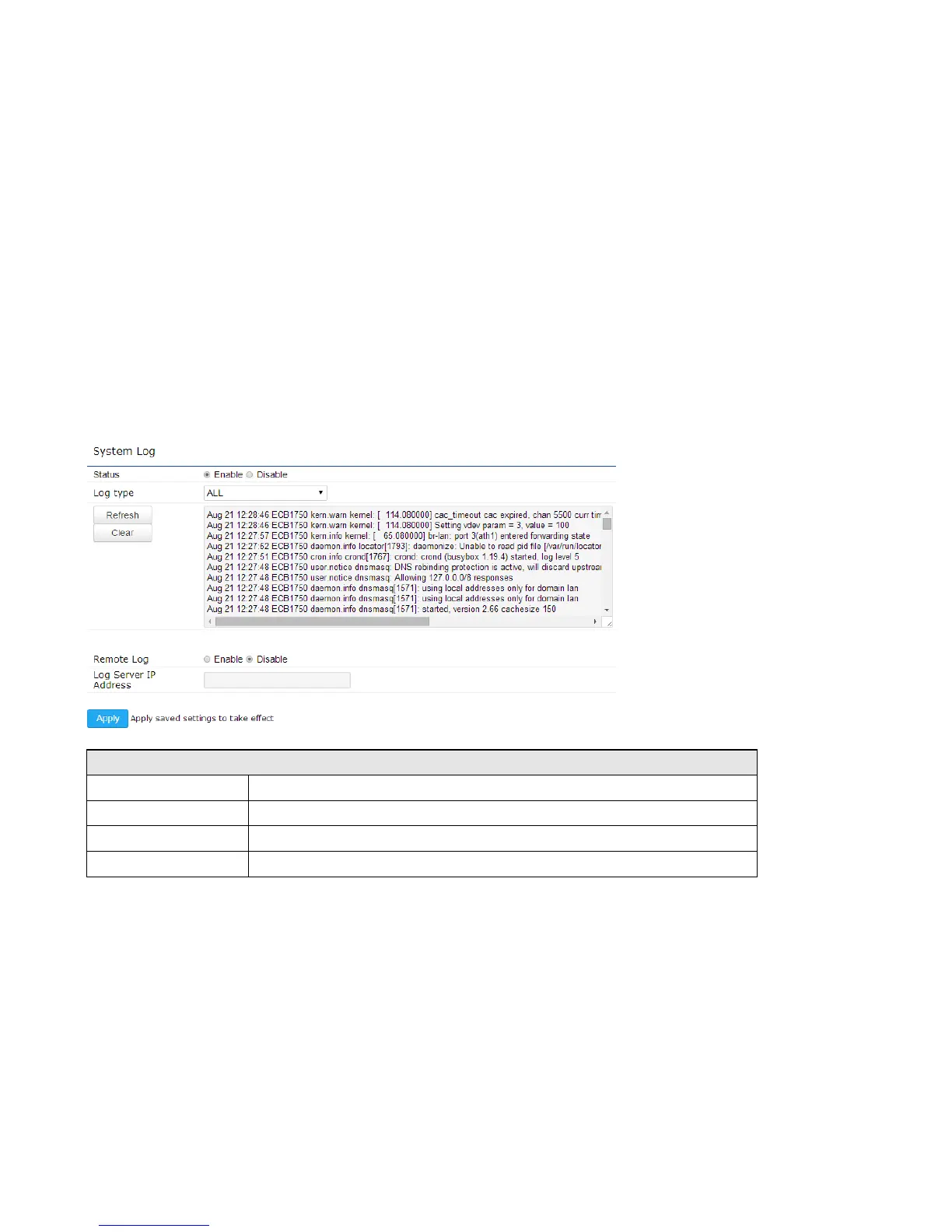 This page allows you to set up the System log and local log functions of the ECB1200. Click Log under the System
