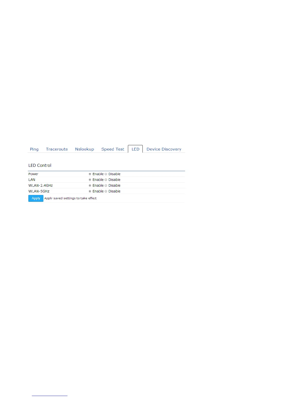This page allows you to control LED on/off for Power, LAN interface and 2.4GHz/5GHz WLAN interface. Click Tools under