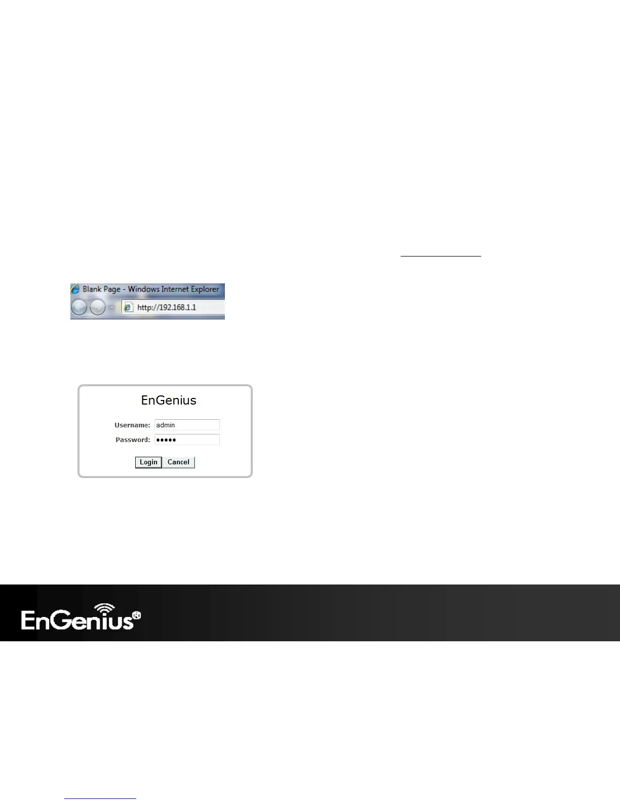Open a web browser (Internet Explorer/Firefox/Safari) and enter the IP Address: http://192.168.1.1