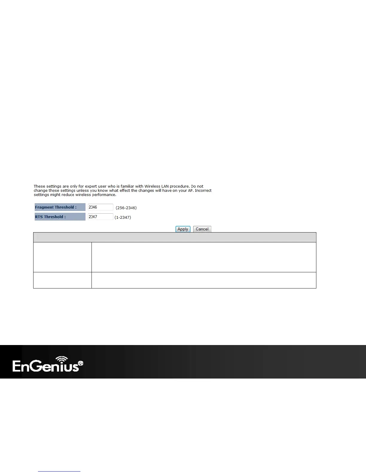 Fragment Threshold Specifies the maximum size of the packet per fragment. This function can reduce the chance of