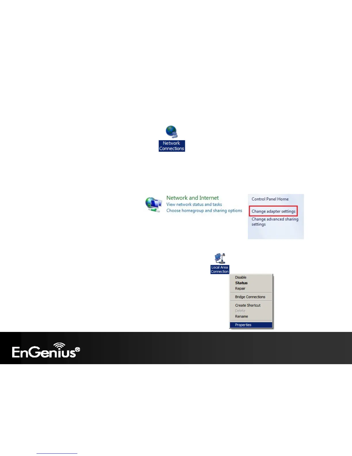 In Windows 7, click View Network Status and Tasks in the Network and Internet section, then select Change