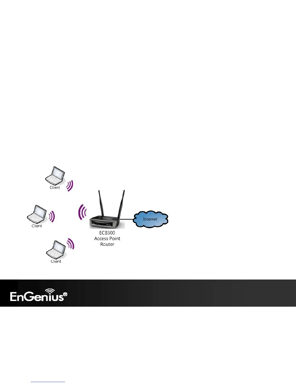 In Access Point Router Mode, ECB300 grants Internet access to multiple wireless clients. In this mode, the ECB300’s internal