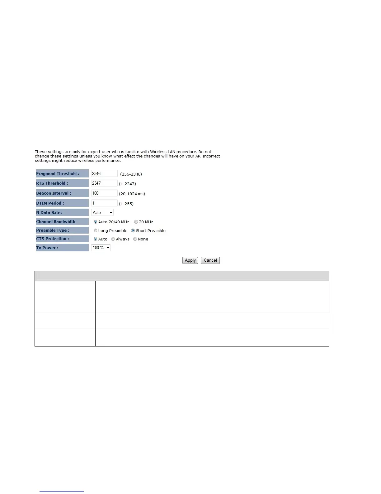 Fragment Threshold Specifies the maximum size of the packet per fragment. This function can reduce the chance of