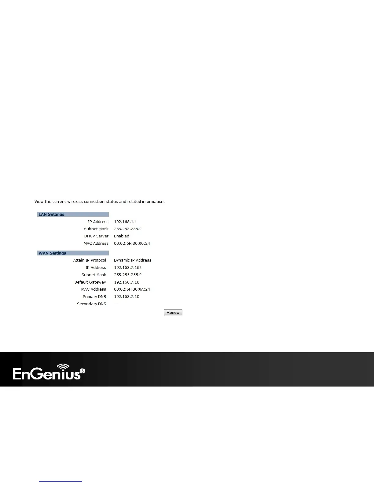 The Status option of the Network menu shows the current status of the ECB300’s LAN and WAN (Router mode)